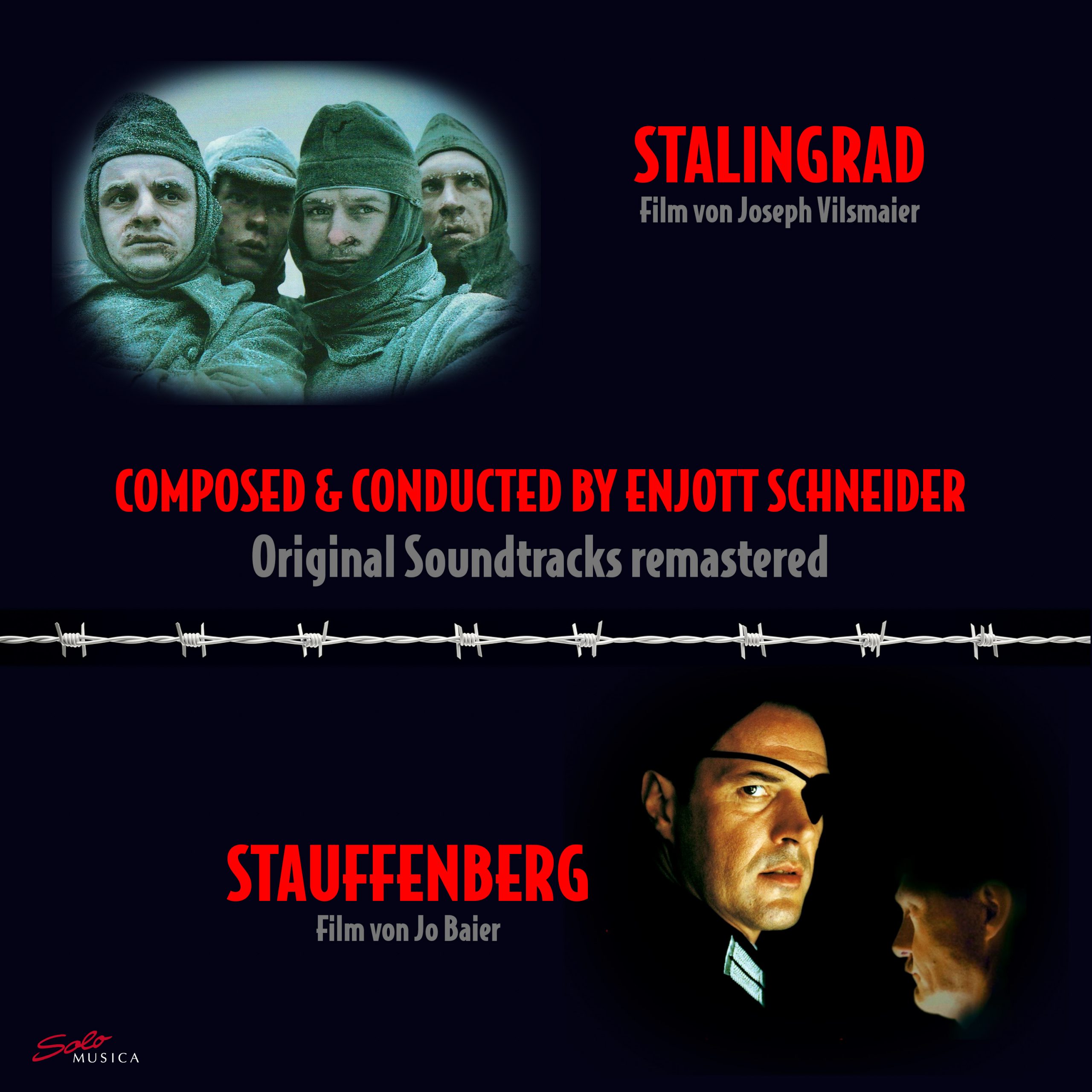 Diese digitale Veröffentlichung von Solo Musica vereint zwei gewichtige Soundtracks made in Germany, komponiert und dirigiert von Enjott Schneider: STALINGRAD (Film von Joseph Vilsmaier, 1992) und STAUFFENBERG (Film von Jo Baier, 2004). Beide spielen im historischen Kontext des 2. Weltkriegs und definieren sich als Anti-Kriegsfilme: STALINGRAD handelt vom Untergang der 6. Armee an der russischen Ostfront, wo die versuchte Eroberung der Stadt Stalingrad in Chaos und unsäglichem Leid endet. Vom anfänglichen Optimismus und einer von Ideologie gesteuerten Aggressivität bleibt nur Rückzug, Heimweh, Schmerz und grauenhaftes Sterben. STAUFFENBERG, mit dem Untertitel „Aufstand des Gewissens“, handelt vom Attentat des Claus Schenk Graf von Stauffenberg, der am 20. Juli 1944 mit einer selbst gezündeten Bombe den nationalsozialistischen Diktator Adolf Hitler zu töten versuchte. Der mit Freunden geplante Putsch misslang, weil Hitler das Attentat überlebte. Die aufständischen Helden werden standrechtlich erschossen.